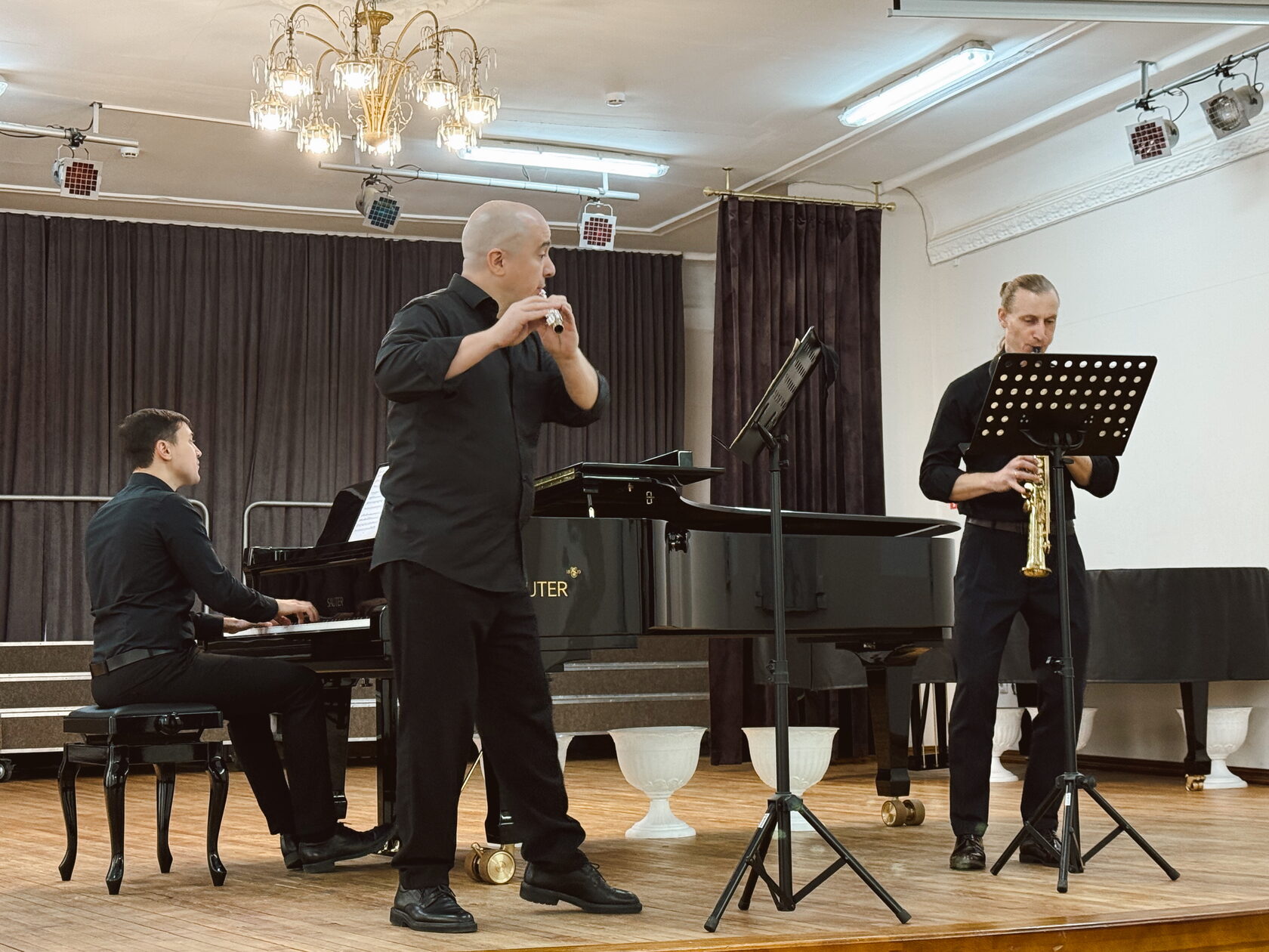 Церемонию открытия продолжил концерт членов конкурсной комиссии. Великолепную игру на духовых инструментах продемонстрировали доцент кафедры духовых и ударных инструментов Новосибирской государственной консерватории им. М.И. Глинки Иван Александрович Шиханов, преподаватель Иркутского музыкального колледжа им. Ф. Шопена Андрей Александрович Пухтий и концертмейстер группы труб Губернаторского симфонического оркестра Иркутской областной филармонии Михаил Рафаилович Сторожев.