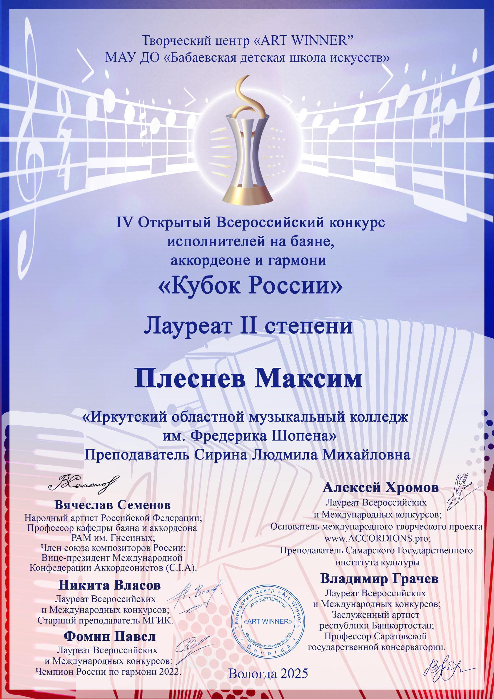 Поздравляем студента 1 курса специальности Инструментальное исполнительство Максима Плеснева (аккордеон), Лауреата II степени конкурса!